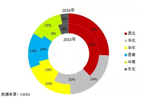 與2015年相比,2016年我國華北地區(qū)和華東地區(qū)以及中南地區(qū)占比均出現(xiàn)了增長,其中華東地區(qū)占比由13%增長到20%,中南地區(qū)占比由9%增長到13%;西北地區(qū)和東北地區(qū)均出現(xiàn)減少,其中西北地區(qū)占比由38%下降到26%;西南地區(qū)占比維持不變。