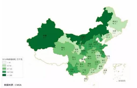圖4 2016年中國各?。▍^(qū)、市)新增風(fēng)電裝機(jī)容量
