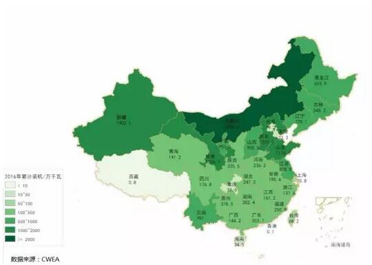 圖5 2016年中國各?。▍^(qū)、市)累計風(fēng)電裝機(jī)容量