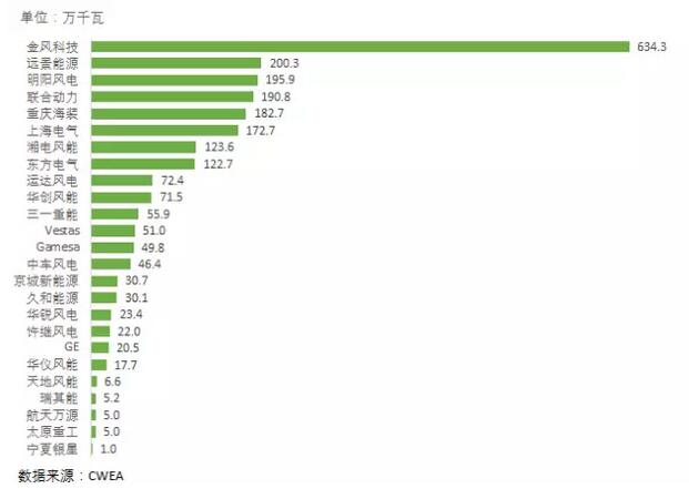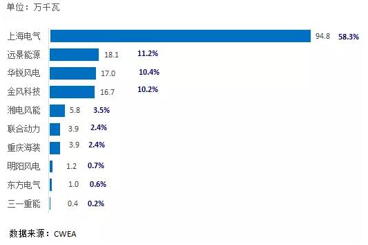 表1 2016年中國風(fēng)電整機(jī)制造企業(yè)新增裝機(jī)容量(數(shù)據(jù)來源:CWEA)
