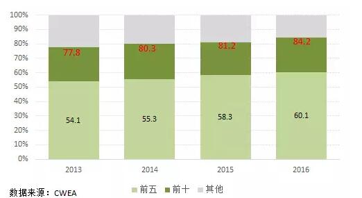 近4年,風(fēng)電整機(jī)制造企業(yè)的市場份額逐漸趨于集中。排名前五的風(fēng)電機(jī)組制造企業(yè)市場份額由2013年的54.1%增加到2016年的60.1%,排名前十的風(fēng)電制造企業(yè)市場份額由2013年的77.8%增長到2016年的84.2%。