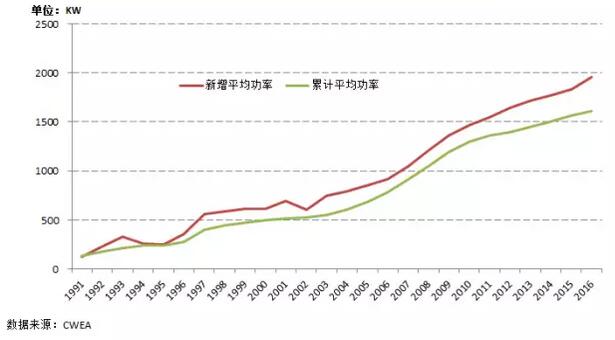 2016年,我國新增裝機(jī)的風(fēng)電機(jī)組平均功率1955kW,與2015年的1768kW相比,增長6.4%;累計裝機(jī)的風(fēng)電機(jī)組平均功率為1608kW,同比增長2.9%。
