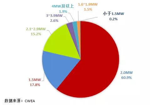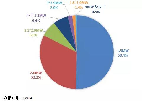 2016年,我國累計風(fēng)電裝機(jī)中,1.5MW的風(fēng)電機(jī)組仍占主導(dǎo)地位,占總裝機(jī)容量的50.4%,同比下降約5個百分點;2MW的風(fēng)電機(jī)組市場份額上升至32.2%,同比上升約5個百分點。