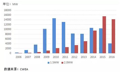 圖14 2006年至2016年1.5MW和2.0MW機(jī)組新增裝機(jī)容量