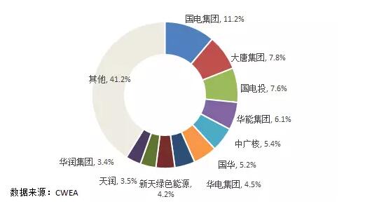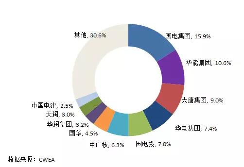 2016年,中國風(fēng)電有新增裝機(jī)的開發(fā)商企業(yè)超過100家,前十家裝機(jī)容量超過1300萬千瓦,占比達(dá)到58.8%。累計裝機(jī)前十家的開發(fā)企業(yè)裝機(jī)容量超過1億千瓦,占比達(dá)到69.4%。