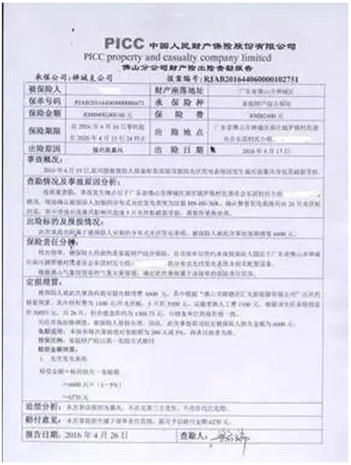 該保險(xiǎn)理賠單清楚地展示了被保險(xiǎn)的投保金額、理賠金額和事故概況,真實(shí)展示了光伏電站的理賠全過(guò)程。黎生家的分布式光伏發(fā)電設(shè)備共由26片光伏板組成,2016年4月17日因強(qiáng)對(duì)流天氣導(dǎo)致5片光伏板損壞,業(yè)主就5片受損組件向保險(xiǎn)公司申請(qǐng)修復(fù)理賠。對(duì)此保險(xiǎn)公司給出定損理算: