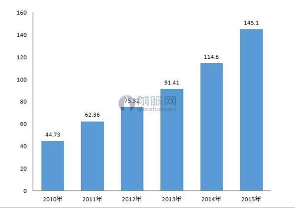 2010-2015年全國風電裝機容量規(guī)模(單位:GW)