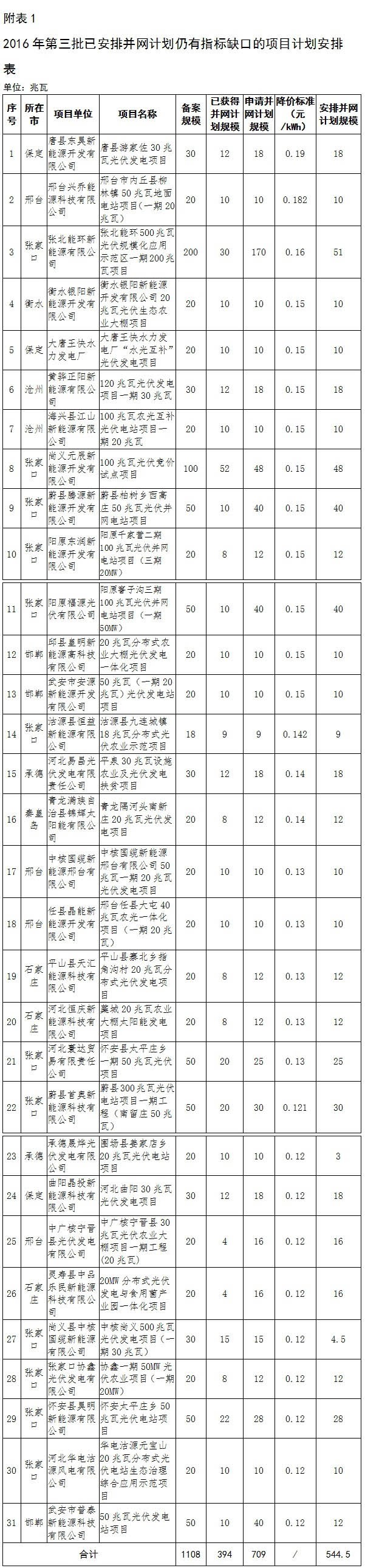 按照國(guó)家能源局《關(guān)于調(diào)整2016年光伏發(fā)電建設(shè)規(guī)模有關(guān)問(wèn)題的通知》(國(guó)能新能〔2016〕383號(hào))要求,經(jīng)各市發(fā)改委申報(bào)、企業(yè)競(jìng)價(jià)承諾、電網(wǎng)公司確認(rèn),現(xiàn)將2016年第三批普通光伏發(fā)電項(xiàng)目并網(wǎng)計(jì)劃予以下達(dá),并就有關(guān)事項(xiàng)通知如下: