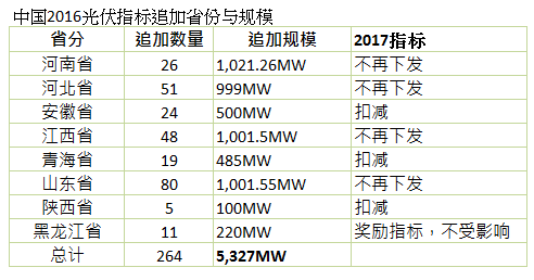 資料顯示,河南、河北、安徽、江西、青海、山東、陜西、黑龍江等八個省份迄今共增加了264個專案項目,規(guī)模超過5.3GW;其中部分省分因追加規(guī)模超過1GW,2017年將不再享有補貼指標。