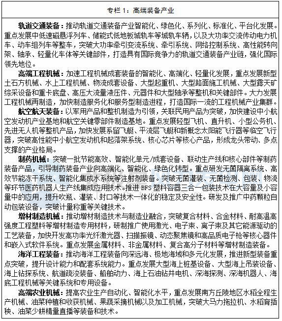 順應(yīng)制造業(yè)智能化、綠色化、服務(wù)化、國(guó)際化發(fā)展趨勢(shì),加快突破關(guān)鍵技術(shù)與核心部件,推進(jìn)重大裝備與系統(tǒng)的應(yīng)用和產(chǎn)業(yè)化。重點(diǎn)發(fā)展軌道交通、高端工程機(jī)械、航空航天、制藥機(jī)械、增材制造、海洋工程、高端農(nóng)業(yè)機(jī)械等產(chǎn)業(yè),推動(dòng)高端裝備與信息技術(shù)融合,提高核心技術(shù)裝備的性能、質(zhì)量和市場(chǎng)占有率。