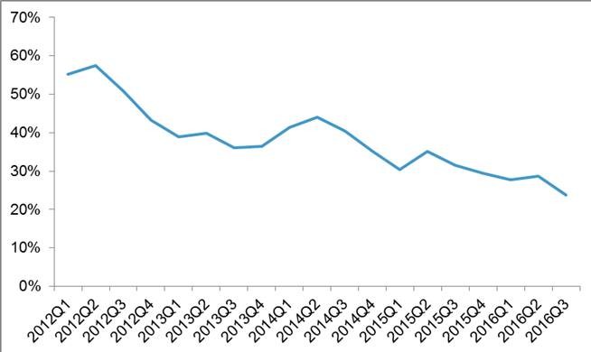 圖1:2012~2016年單晶市場(chǎng)份額情況
