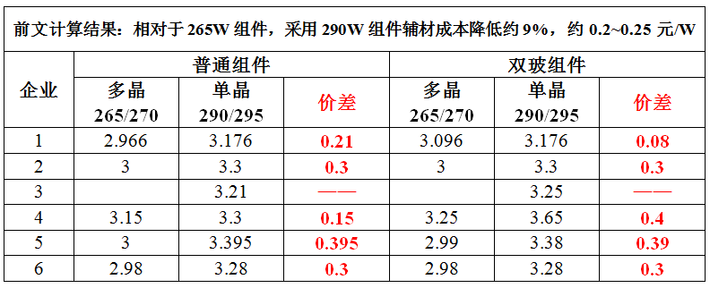 如果單晶采用高效組件,如290Wp,則相對(duì)于265Wp的多晶組件,輔材成本可以降低約9%,即0.2~0.25元/W之間。
