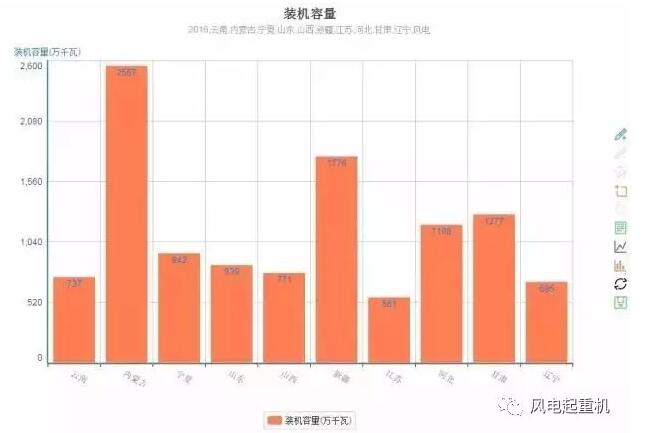 內(nèi)蒙古2557萬千瓦、新疆1776萬千瓦、甘肅1277萬千瓦、河北1188萬千瓦、寧夏942萬千瓦、山東839萬千瓦、山西771萬千瓦、云南737萬千瓦、遼寧695萬千瓦、江蘇561萬千瓦。