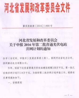 中國(guó)儲(chǔ)能網(wǎng)訊:今年,國(guó)家下達(dá)河北省普通光伏電站建設(shè)規(guī)模100萬(wàn)千瓦,第一批已安排并網(wǎng)計(jì)劃77.14萬(wàn)千瓦,為做好第二批并網(wǎng)計(jì)劃申報(bào)工作,河北省發(fā)改委下達(dá)第二批普通光伏電站并網(wǎng)計(jì)劃的通知。