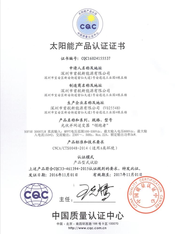“高標(biāo)準(zhǔn),成就高品質(zhì)!”此次證書的取得,標(biāo)志著首航新能源SOFAR3000TL,SOFAR5000TLM型號光伏并網(wǎng)逆變器,已經(jīng)完全滿足“領(lǐng)跑者”相關(guān)標(biāo)準(zhǔn),研發(fā)技術(shù)達(dá)到行業(yè)領(lǐng)先水平。