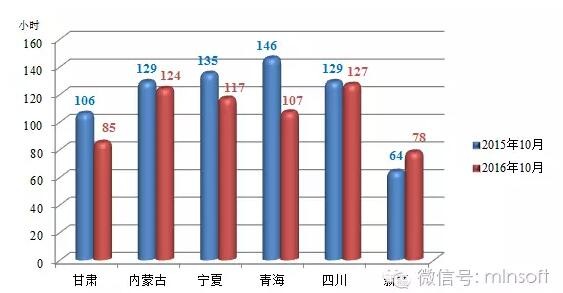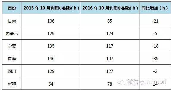 由以上圖表可以看出,2016年10月,新疆平均利用小時(shí)數(shù)比去年同期增加14小時(shí),四川與去年同期基本持平,其他四省與去年同期相比均有不同程度降低。其中新疆10月平均利用小時(shí)數(shù)為78小時(shí),比去年同期增加14小時(shí);四川10月平均利用小時(shí)數(shù)為127小時(shí),比去年同期減少2小時(shí);內(nèi)蒙古10月平均利用小時(shí)數(shù)為124小時(shí),比去年同期減少5小時(shí);青海10月平均利用小數(shù)與去年同期相比變化最為劇烈,減少39小時(shí);甘肅其次,比去年同期減少了21小時(shí);寧夏10月平均利用小數(shù)也比去年同期減少了18小時(shí)。