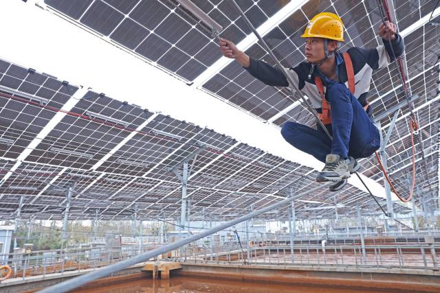 現(xiàn)場(chǎng)工人在對(duì)光伏發(fā)電組件進(jìn)行維護(hù)工作