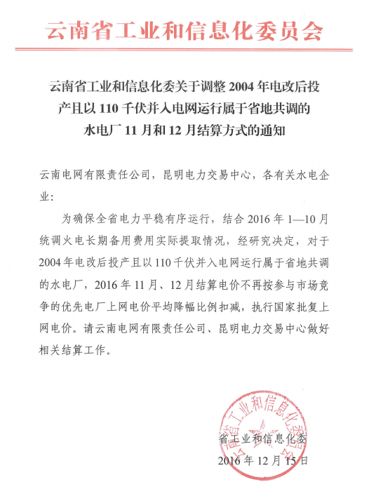 中國(guó)儲(chǔ)能網(wǎng)訊:云南省工業(yè)和信息化委近日發(fā)布關(guān)于調(diào)整2004年電改后投產(chǎn)且110千伏并入電網(wǎng)運(yùn)行屬于省地共調(diào)的水電廠11月和12月結(jié)算方式的通知,詳情如下: