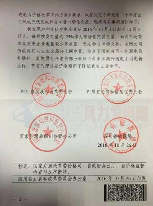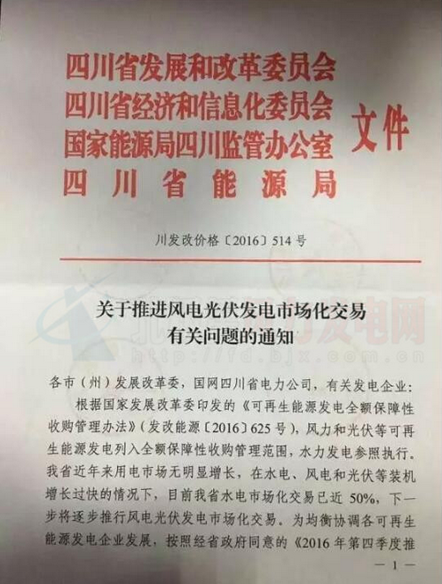 中國(guó)儲(chǔ)能網(wǎng)訊:四川發(fā)改委、經(jīng)信委、國(guó)家能源局四川監(jiān)管辦以及四川能源局近日聯(lián)合發(fā)布《關(guān)于推進(jìn)風(fēng)電光伏發(fā)電市場(chǎng)化交易有關(guān)問題的通知》。通知指出,四川省第四季度將試行風(fēng)電光伏市場(chǎng)化交易,從10月1日至12月31日四川省風(fēng)光企業(yè)每月按發(fā)電量的25%作為市場(chǎng)交易量。以下為文件內(nèi)容: