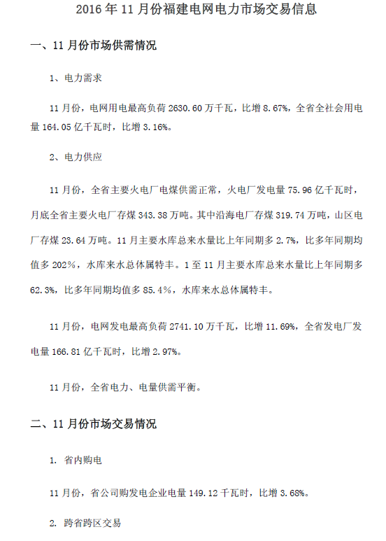 中國儲(chǔ)能網(wǎng)訊:福建電力交易中心近日發(fā)布了2016年11月份福建電網(wǎng)電力市場(chǎng)交易信息,并預(yù)測(cè)12月份的用電量達(dá)到161億千瓦時(shí),詳情如下: