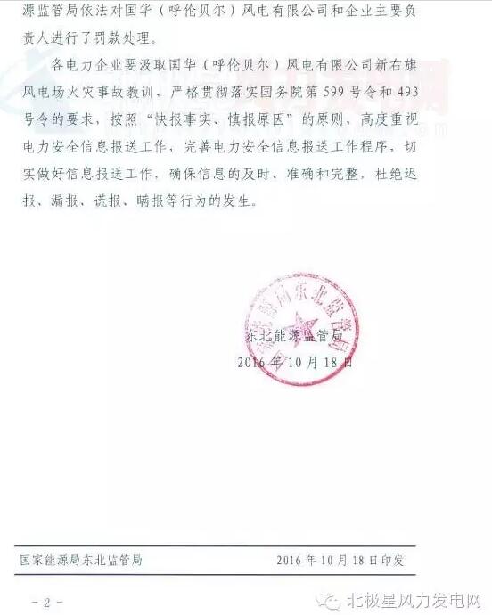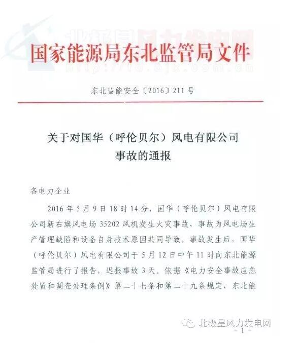 中國儲能網(wǎng)訊:國家能源局東北監(jiān)管局近日通報一起風電事故。2016年5月9日,國華(呼倫貝爾)風電有限公司新右旗風電場35202風機發(fā)生火災(zāi)事故,經(jīng)調(diào)查事故為風電場生產(chǎn)管理缺陷和設(shè)備自身技術(shù)原因共同導致。東北能監(jiān)局依法對國華(呼倫貝爾)風電有限公司和企業(yè)主要負責人進行了罰款處理。以下為通報原文:
