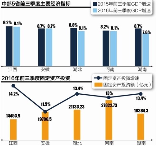截至10月25日,除山西外,中部五省陸續(xù)發(fā)布了2016年前三季度的經(jīng)濟運行數(shù)據(jù),江西、安徽、湖北、河南、湖南GDP增速分別為9.1%、8.7%、8.1%、8.1%、7.6%。