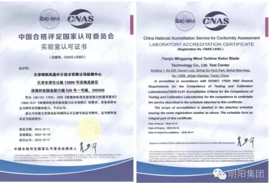 明陽風能葉片檢測中心榮獲中國合格評定委員會頒發(fā)的CNAS認可證書