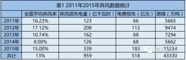 從統(tǒng)計(jì)來(lái)看,2011 年至2015 年我國(guó)棄風(fēng)電量累計(jì)損失達(dá)到959 億千瓦時(shí)(三峽、葛洲壩兩座水電站在2015 年的發(fā)電量一共是1048 億千瓦時(shí),2014 年江西省一年的全社會(huì)用電量是1018 億千瓦時(shí))。近五年平均棄風(fēng)率達(dá)到13.4%,電費(fèi)損失累計(jì)約518 億元。相當(dāng)于燒掉原煤4 億多噸,僅2015 年燒掉原煤1.5 億噸。
