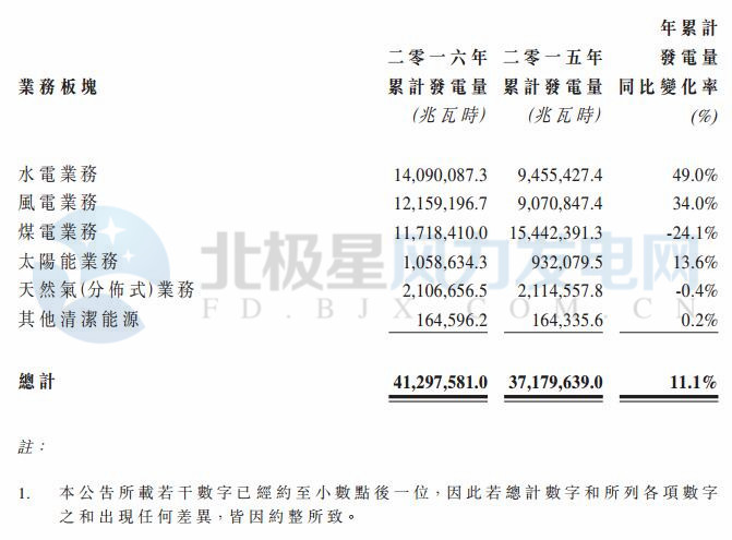 中國儲(chǔ)能網(wǎng)訊:華電福新2016年完成總發(fā)電量412.98億千瓦時(shí)(41,297,581.0兆瓦時(shí)),同比增加11.1%。其中,風(fēng)電發(fā)電量為121.59億千瓦時(shí)(12,159,196.7兆瓦時(shí)),同比增加34.0%;水電發(fā)電量為140.90億千瓦時(shí)(14,090,087.3兆瓦時(shí)),同比增加49.0%;太陽能發(fā)電量為10.59億千瓦時(shí)(1,058,634.3兆瓦時(shí)),同比增加13.6%;天然氣(分布式)發(fā)電量為21.07億千瓦時(shí)(2,106,656.5兆瓦時(shí)),同比下降0.4%;其他清潔能源發(fā)電量為1.65億千瓦時(shí)(164,596.2兆瓦時(shí)),同比增加0.2%。以下為具體數(shù)據(jù):