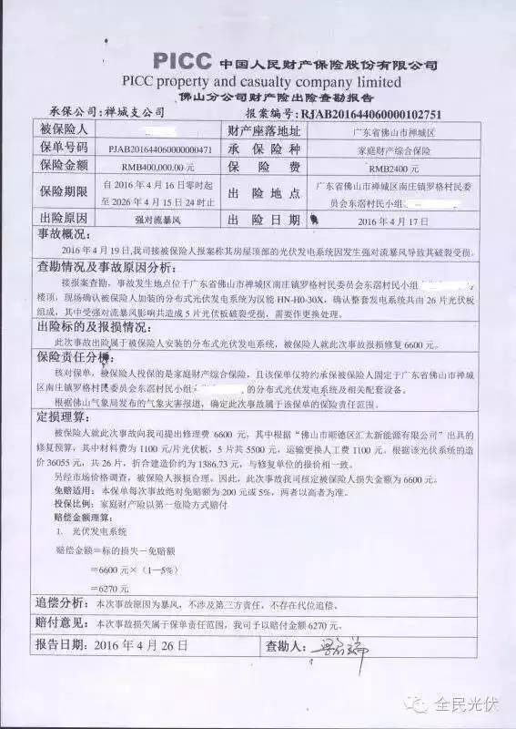今年4月17日,南莊羅格村黎生家的分布式光伏發(fā)電設(shè)備因強(qiáng)對(duì)流天氣導(dǎo)致部分損壞。黎生19日?qǐng)?bào)案,人保公司查勘員當(dāng)天查勘完畢,黎生25日交齊索賠資料,人保公司26日支付賠款6270元?!安榭眻?bào)告”中簡(jiǎn)述了事故原因:事故發(fā)生地點(diǎn)位于廣東省佛山市禪城區(qū)某樓頂,現(xiàn)場(chǎng)確認(rèn)被保險(xiǎn)人加裝的分布式光伏發(fā)電系統(tǒng)為XX,確認(rèn)整套發(fā)電系統(tǒng)共由26片光伏板組成,其中受強(qiáng)對(duì)流暴風(fēng)影響共造成5片光伏板破損受損,需要更換處理。