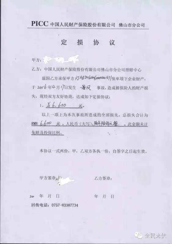 下圖為廣東省佛山市禪城區(qū)的一張光伏保險(xiǎn)理賠報(bào)告和定損協(xié)議。該保險(xiǎn)理賠單清楚地展示了被保險(xiǎn)的投保金額、理賠金額和事故概況,真實(shí)展示了光伏電站的理賠全過(guò)程。