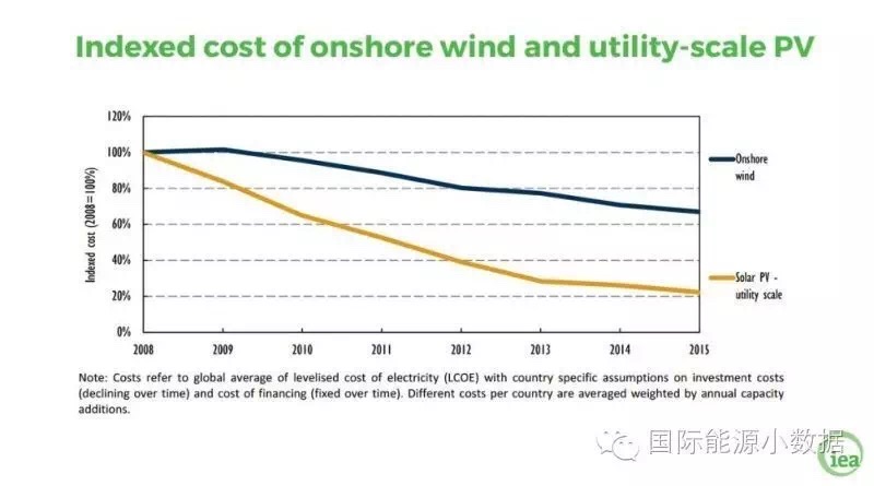 中國(guó)儲(chǔ)能網(wǎng)訊:根據(jù)國(guó)際能源署的數(shù)據(jù),2008年至2015年全球陸上風(fēng)電的度電平準(zhǔn)成本(levelized cost of electricity,考慮設(shè)備投資、融資成本,各國(guó)數(shù)據(jù)加權(quán)平均)下降了35%,而同期地面光伏電站的度電平準(zhǔn)成本下降了80%。