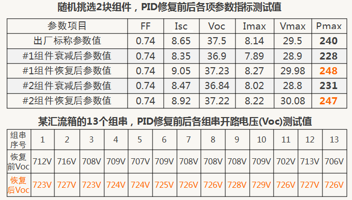 陽光電源逆變器擁有自主專利PID效應(yīng)解決方案,能保護(hù)組件可靠運(yùn)行。逆變器在白天可以防護(hù)PID效應(yīng),在夜間還可以實(shí)現(xiàn)PID修復(fù)。通過在組件負(fù)極與地之間施加正電壓,實(shí)現(xiàn)PID修復(fù)功能,將已經(jīng)發(fā)生PID效應(yīng)的組件恢復(fù)至正常狀態(tài)。南方某沿海城市屋頂分布式光伏電站的案例中,由于前期設(shè)計未采用抗PID效應(yīng)方案,并網(wǎng)一年后部分組件由于PID效應(yīng)導(dǎo)致的衰減超過30%。通過采用陽光電源夜間PID修復(fù)解決方案,經(jīng)過42小時的PID修復(fù)后,組件各項(xiàng)參數(shù)100%恢復(fù)正常。