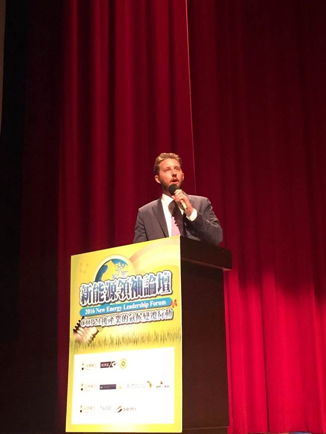 Google全球能源政策開發(fā)經(jīng)理漢納(Marsden Hanna)今天出席「新能源領(lǐng)袖論壇」會議,說明公司購買綠電原則。(王玉樹攝)