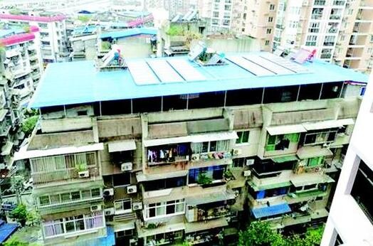 湖北西陵區(qū)樵湖嶺9號是一棟上世紀90年代建的老樓,屋頂漏水嚴重、天臺臟亂差影響著42戶居民的生活。西陵區(qū)政府牽頭,湖北三峽新能源有限公司與居民簽署協(xié)議,在屋頂建成分布式光伏發(fā)電站(如圖)。對于居民來講,不僅可以分到發(fā)電帶來的部分收益,還完美解決了老樓漏水、屋頂臟亂差的問題;對于投資方來講,免去租金得到了“場地”,且在完成經(jīng)濟效益的同時,也服務(wù)了居民;對于政府來講,則是探索出一條“光伏發(fā)電+棚戶改造”的新路子。這一模式,還是宜昌城區(qū)首例。