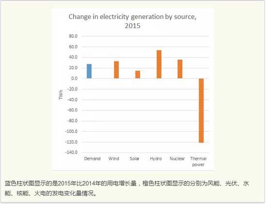 藍(lán)色柱狀圖顯示的是2015年比2014年的用電增長(zhǎng)量,橙色柱狀圖顯示的分別為風(fēng)能、光伏、水能、核能、火電的發(fā)電變化量情況。