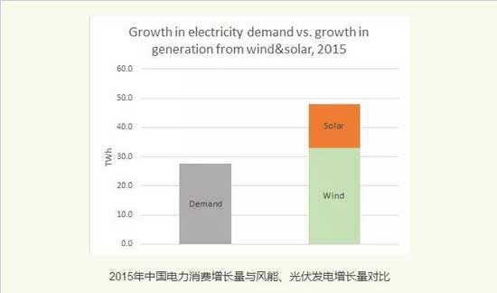 一、2015年中國(guó)風(fēng)能和太陽(yáng)能發(fā)電的增長(zhǎng)量是電力需求增長(zhǎng)總量的兩倍