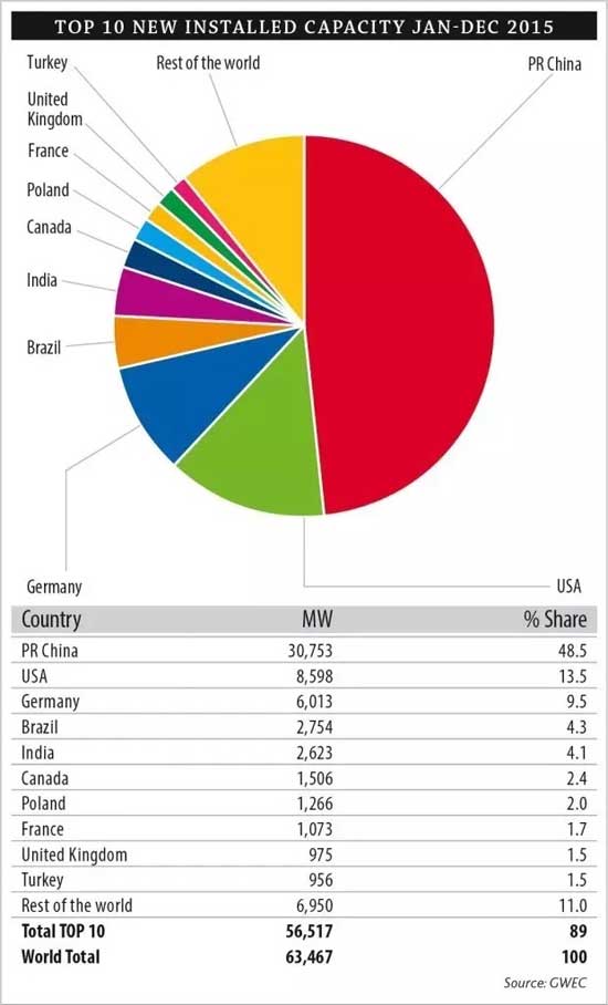 2015年中國(guó)的風(fēng)電裝機(jī)量占全球風(fēng)電裝機(jī)總量的二分之一