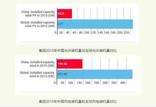 2015年,中國(guó)風(fēng)電和光伏裝機(jī)量較上年分別增加了28%和54%,這讓2015年中國(guó)可再生能源發(fā)電量迅猛增加有了可能。從總體看,去年中國(guó)新增風(fēng)電和光伏裝機(jī)占全球新增裝機(jī)的一半左右。