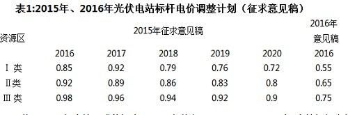 表1:2015年、2016年光伏電站標桿電價調(diào)整計劃(征求意見稿)