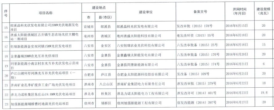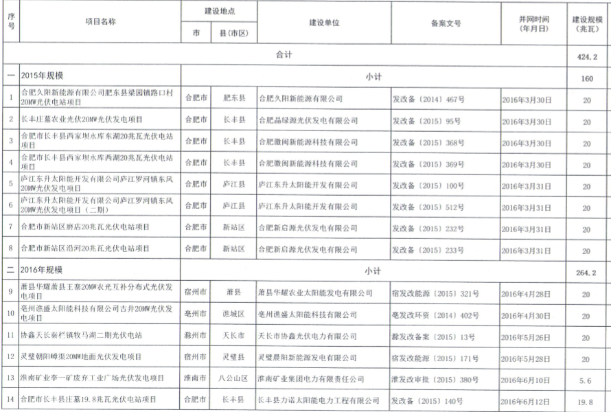 根據(jù)我局《關(guān)于進(jìn)一步加強光伏電站項目開發(fā)管理的通知》(皖能源新能〔2015〕26號)和《關(guān)于完善“先建先得”分布式光伏電站管理的通知》(皖能源新能〔2016〕13號)等文件規(guī)定,按并網(wǎng)先后順序,將我省2015年結(jié)余和2016年部分新增建設(shè)規(guī)模424.2兆瓦,配置給合肥久陽新能源有限公司肥東縣梁園鎮(zhèn)路口村20MW等23個光伏電站項目。