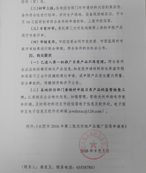 附件1:合肥市經(jīng)信委《關(guān)于組織申報(bào)2016年第二批光伏地產(chǎn)品推廣目錄的通知》