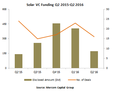 Mercom Capital關于太陽能資金和并購(M&A)活動的最新報告顯示出太陽能行業(yè)形勢并非一片大好。2016年第二季度,風險投資資金減少了一半以上,而債務融資相比于上一季度下降了43%。公開市場融資還維持在1.79億美元,比上一季度翻番,但去年同期下降10%。