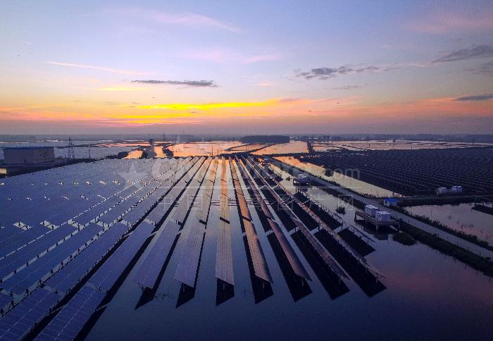 2016年8月23日,無人機(jī)正在華東最大的水上光伏發(fā)電基地,位于江蘇興化李中鎮(zhèn)蘇宋村的華電(興化)太陽能發(fā)電項目檢查光伏設(shè)備運行情況。