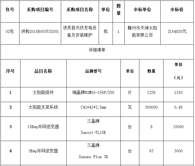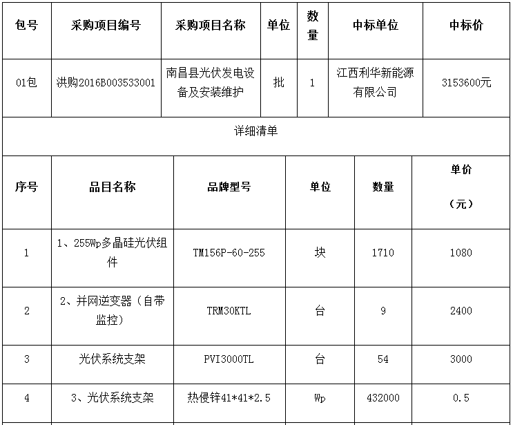 中國(guó)儲(chǔ)能網(wǎng)訊:近日,“南昌市光伏扶貧工程”兩個(gè)采購(gòu)項(xiàng)目——南昌縣光伏發(fā)電設(shè)備及安裝維護(hù)(洪購(gòu)2016B003533001)、進(jìn)賢縣光伏發(fā)電設(shè)備及安裝維護(hù)(洪購(gòu)2016B003532001)采取公開(kāi)招標(biāo)方式進(jìn)行第二次采購(gòu)。本次采購(gòu)活動(dòng)于2016年8月1日09:30時(shí)在江西省南昌公共資源交易中心五樓8號(hào)開(kāi)標(biāo)室進(jìn)行,共有兩家企業(yè)中標(biāo),01包中標(biāo)企業(yè)為江西利華新能源有限公司,02包為贛州市天坤太陽(yáng)能有限公司。