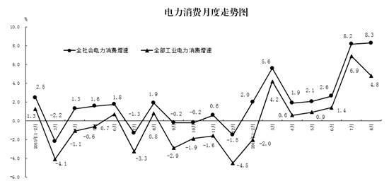 8月份,全社會用電同比增長8.3%,增速比7月份加快0.1個百分點;1-8月份,全社會用電同比增長4.2%,增速比1-7月份加快0.6個百分點。