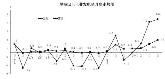 8月份,規(guī)模以上工業(yè)發(fā)電量同比增長7.8%,增速比7月份加快0.6個百分點;1-8月份,規(guī)模以上工業(yè)發(fā)電量同比增長3.0%,增速比1-7月份加快1.0個百分點。