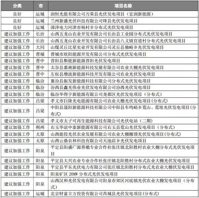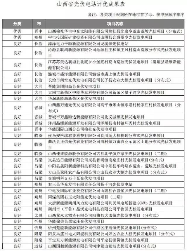 中國儲(chǔ)能網(wǎng)訊:記者從相關(guān)渠道獲悉,山西省對(duì)2016年普通光伏項(xiàng)目競爭性配置評(píng)優(yōu)結(jié)果已進(jìn)行公示,57家納入合格性評(píng)審范圍內(nèi)的項(xiàng)目中,2家優(yōu)秀、33家良好、22家建議加強(qiáng)工作。其中優(yōu)秀的項(xiàng)目為山西榆社華電中光太陽能有限公司榆社縣北寨鄉(xiāng)荒山荒坡光伏項(xiàng)目(分布式)、中電投國際礦業(yè)投資有限公司山陰縣合盛堡鄉(xiāng)光伏發(fā)電項(xiàng)目。