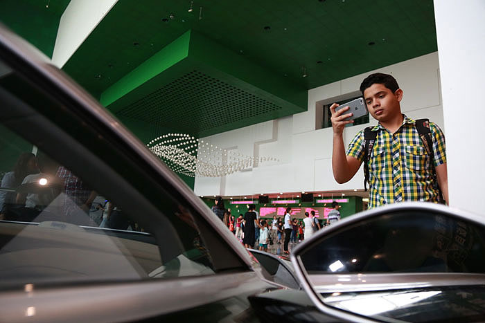 參觀者在漢能全太陽能動力汽車Hanergy Solar R前駐足拍照