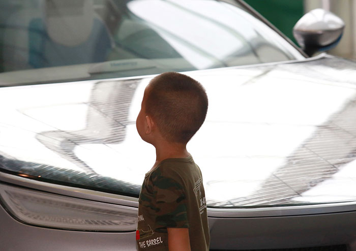 一位小朋友好奇地打量眼前這個“大家伙”——漢能全太陽能動力汽車Hanergy Solar R